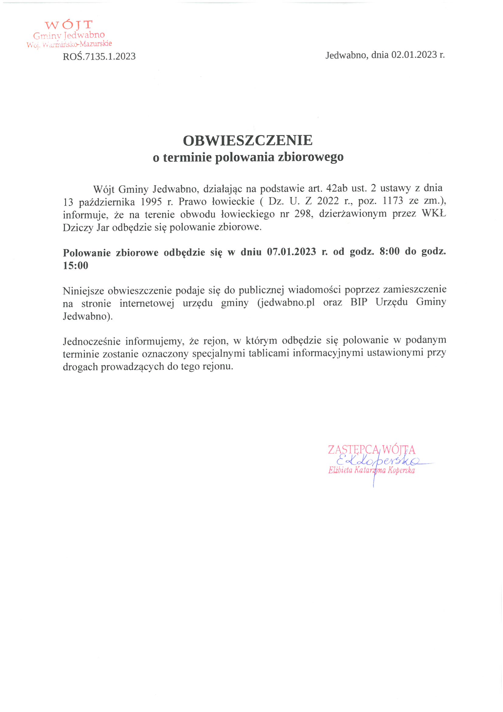 Wersja obowiązująca z dnia 02-01-2023 14:32:40 Drukuj Polowanie zbiorowe w dniu 07.01.2023 w godzinach 08:00-15:00 Załączniki OBWIESZCZENIE o terminie polowania zbiorowego format: image/jpeg, rozmiar: 204.28 KB, data dodania: 02-01-2023 14:32:40